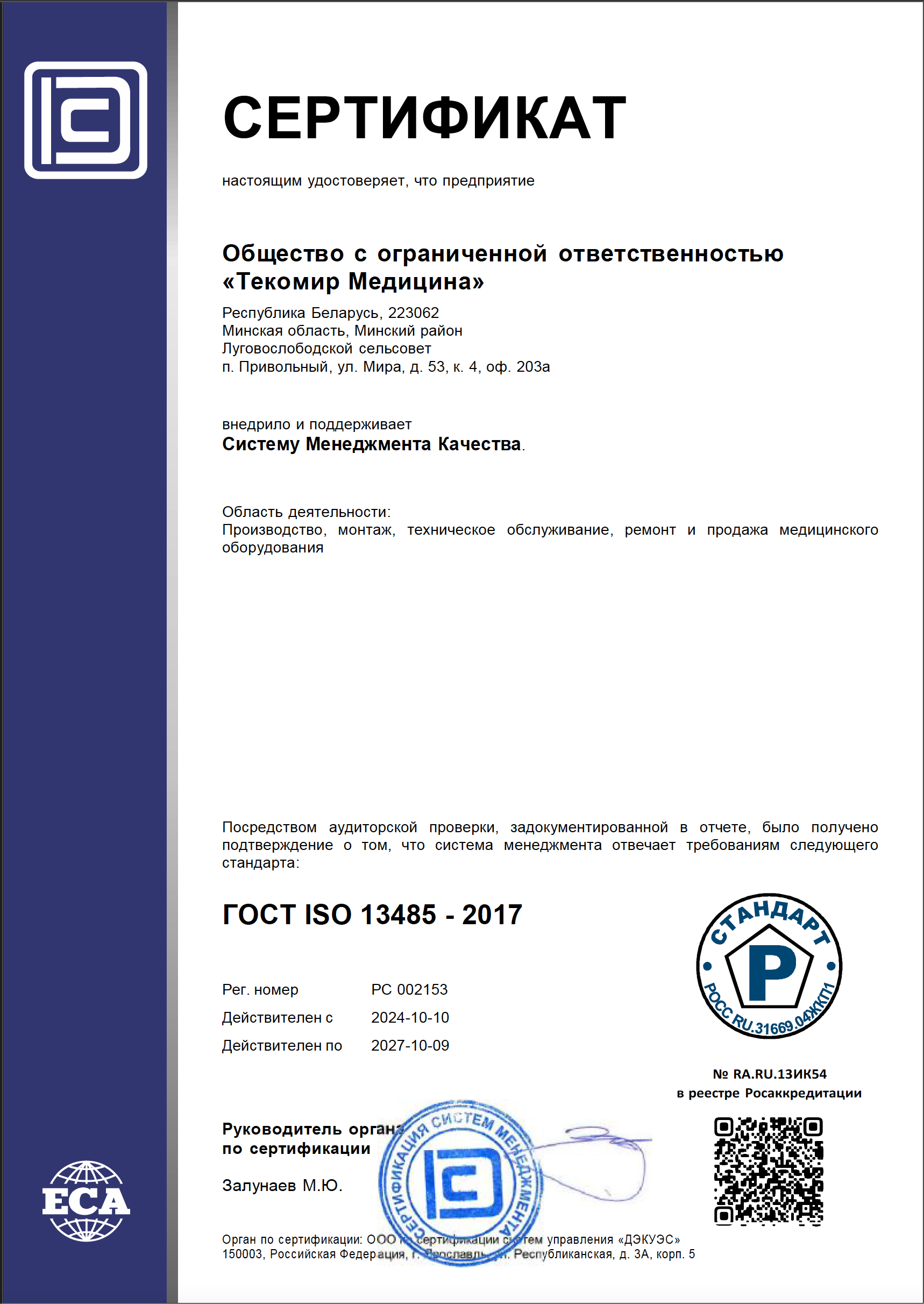 Дорогие Коллеги! Мы рады сообщить об успешном внедрении у нашего партнера ООО «Текомир Медицина» системы менеджмента качества ГОСТ ISO 13485 в целях поддержания качества производимой продукции — медицинских светильников.